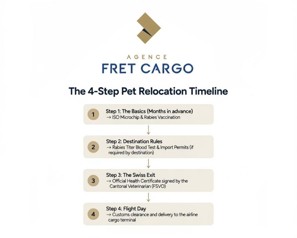 Understanding how to execute an International Pet Relocation from Switzerland means mastering the veterinary timeline. Do not leave this until the last minute.