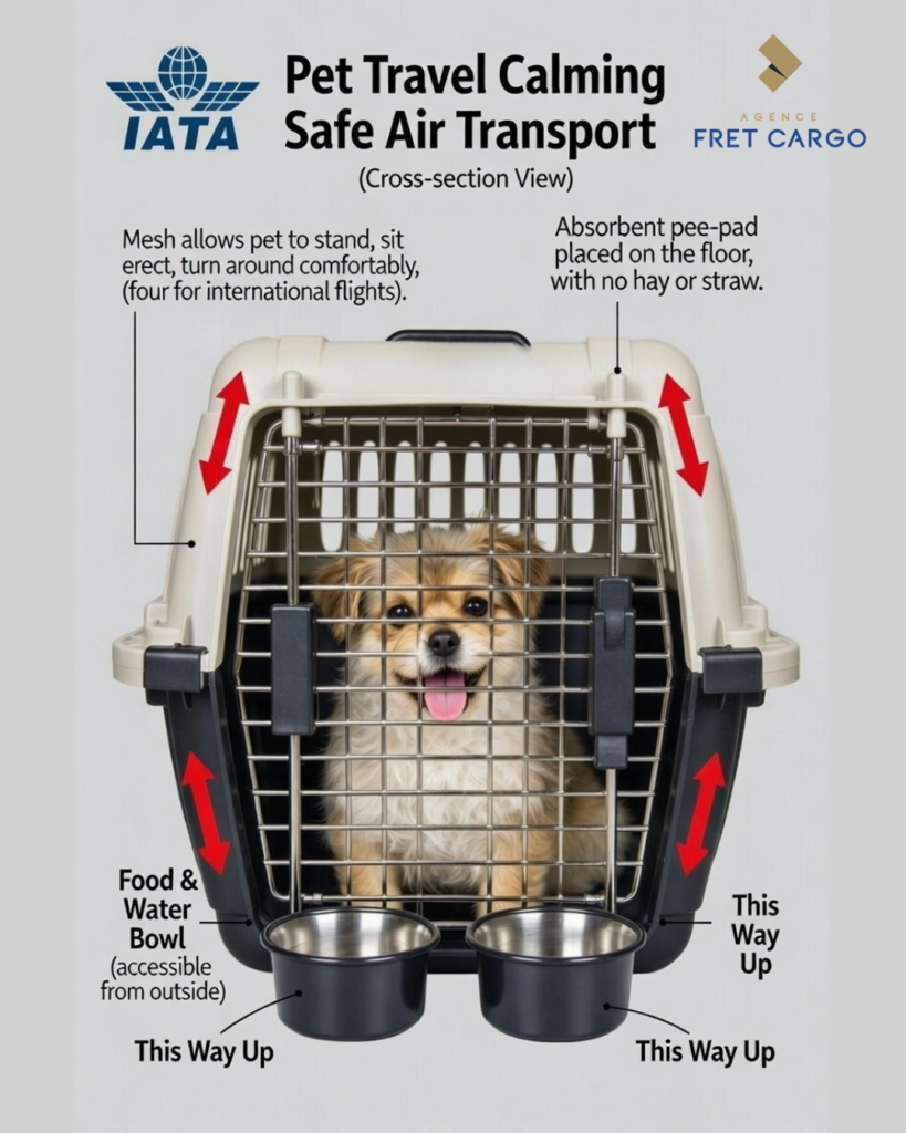 To meet IATA Live Animals Regulations (LAR), the travel kennel must be made of rigid plastic or wood (no wire mesh cages). It must have secure metal nuts and bolts holding the top and bottom together – plastic clips are not allowed. Most importantly, the crate must be sized perfectly: your pet must be able to stand up without touching the roof, sit erect, and turn around comfortably.